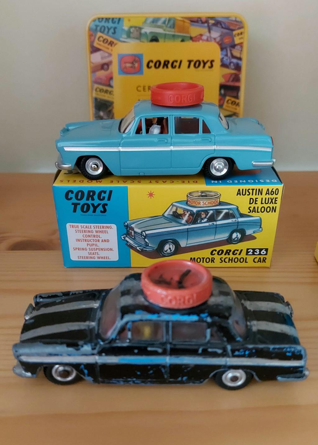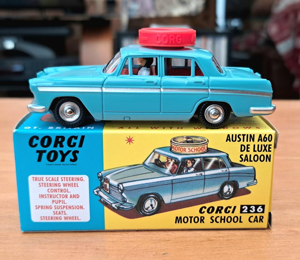 Introduced in June 1964, Corgi 236 was right-hand drive but was complemented by an otherwise identical left-hand drive version for the export market, Corgi 255. Corgi 236 came in a slightly lighter blue than its left-hand drive counterpart. Both stayed in production until 1968. Perhaps unsurprisingly the quintessentially British Austin A60 didn’t help sales abroad, Corgi 236 out-selling 255 by around two to one. Both versions came with a miniature instructor and learner driver.