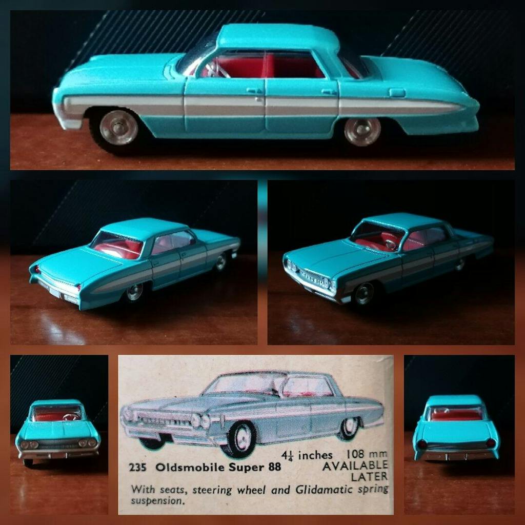 This attractive standard saloon version of Corgis classic Oldsmobile Super 88 casting was introduced into the range in 1962. Modelled on a fifth generation Oldsmobile Super 88, Corgi 235 is an unheralded gem in their 1960s-era back catalogue. Less than 350,000 were produced, making it one of the rarer Corgi Super 88 models a situation resulting from Corgis promotional activity largely concentrating on the Sheriff Car version, which had been released earlier in the year.