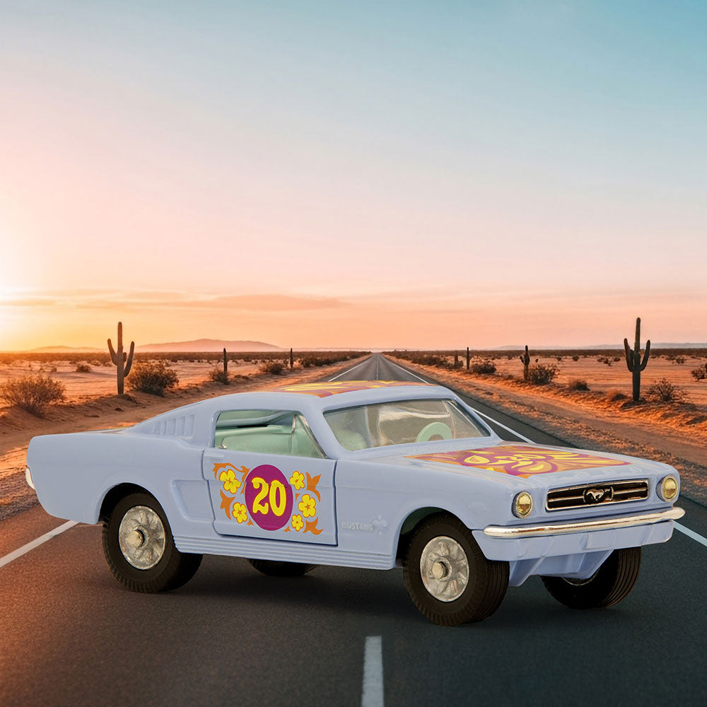 With its distinctive ‘pop art’ livery, the Flower Power Mustang was released in 1968, based on the Corgi 325 Ford Mustang ‘Fastback’ tooling from 1965. Labelled on the box as a ‘stock racing car’, Corgi 348 featured the earlier model’s opening doors, tilting seats and jewelled headlights but was given an updated livery very much in the spirit of the age!
