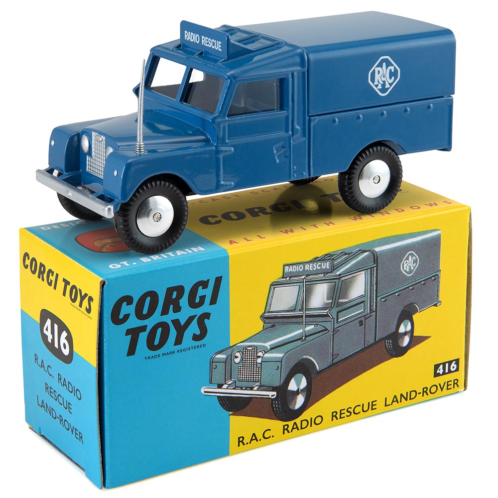 This ‘Series 1’ Land Rover was introduced into the Corgi range in 1959, a re-liveried version of Corgi 351 from the previous year. It omits 351’s bonnet-mounted spare wheel but added an aerial and a roof-mounted Radio Rescue sign, retaining the earlier model’s tinplate ‘tilt’, now with an RAC logo. Just over 200,000 were made, production ending in 1962.