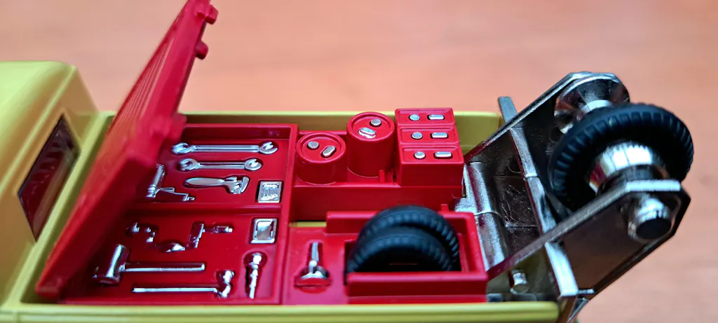 The rear of the model was given a red plastic moulded tool box (with an integral hinged lid that opened to reveal a set of chrome painted tools) and a pair of spare tyres.The VW Breakdown Truck was available in mustard, tan and white – all variants featuring a red painted VW logo. As part of the gift sets, it came with a matching car trailer which was unavailable separately.